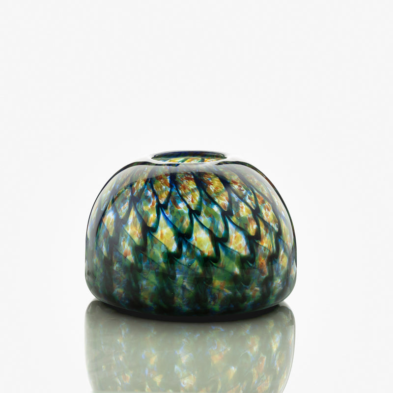 Mønstret i denne elegante og særprægede skål er inspireret af de fiskenet, som gennem generationer er blevet brugt af fiskerne i Østersøen. Farverne er blå, grønne og orange nuancer.