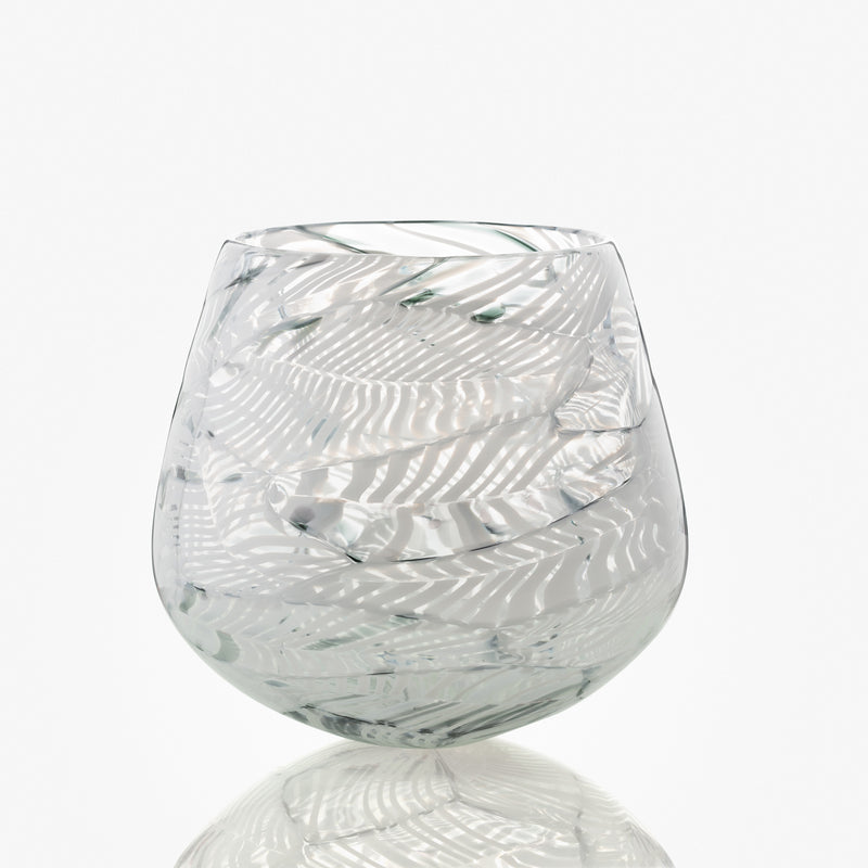 Baltic Sea Glass har gennem årtier produceret glaskunst med motiver inspireret af naturen. Denne elegante skål er inspireret af fjer, nogen vil måske mene, at det ligner blade.