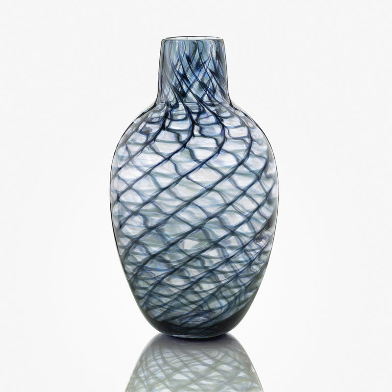 Mønstret i denne elegante vase er inspireret af fiskenet og bølgerne i Østersøen. Flotte grå nuancer og delvis gennemsigtig vase.